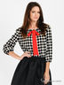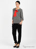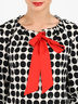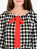 Детали: широкий округлый вырез горловины регулируется контрастной лентой, длинный рукав посажен на манжету на пуговице, принты