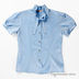 Блузка голубая для девочки. Элегантная модель из ткани с легким блеском. Воротник-стойка в виде оборки с завязками спереди. Застежка на пуговицы с золотистыми блестками. Короткий рукав присборен на манжету.
