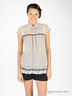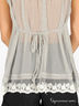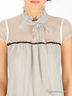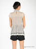 Легкая полупрозрачная блузка из шифона. Воротник стойка, застегивающийся на пуговицы сзади. Сетчатая вставка по верху изделия. Шелковистая эластичная подкладка.