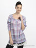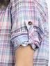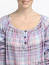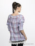 Оригинальная блузка из тонкой хлопковой ткани прямого кроя. Застегивается на пуговицы спереди. Округлый вырез горловины собран ан хлопковую ленту. Длинный прямой рукав собран на хлястик с пуговицей. Низ изделия декорирован шифоновой лентой.