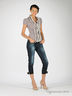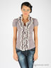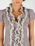 Приталенная хлопковая блузка. Короткие рукава фонарики. Глубокий вырез ворот украшен рюшами с кружевом. Край карманов и талия посажены на резинку.