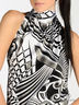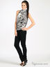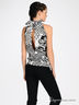 Блузка без рукавов прямого кроя. Воротник-стойка завязывается на бант и переходит в разрез на спине. Снизу блуза присборена многорядной резинкой.