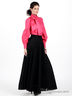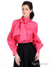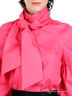 Детали: ворот-стойка, переходящий в ленту, завязывающуюся в бант, застежка на пуговицы, длинный прямой рукав с манжетой на двух перламутровых пуговицах