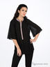 Легкая полупрозрачная блузка прямого покроя. Воротник стойка и планка-застежка на пуговицах бежевого цвета. Короткие расклешенные рукава.