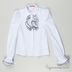 Детали: отложной воротник, застежка на пуговицы, расклешенные рукава, декоративный элемент на полочке