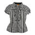 Приталенная модель с отлажным воротом застегивается на пуговицы. Рукав-фонарик. Планка-застежка декорирована рюшами.