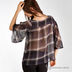 Стильная модель свободного силуэта в клетку с круглым вырезом горловины и расклешенными рукавами 3/4.