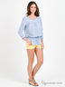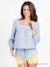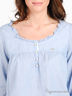 Детали: округлый вырез горловины, длинный рукав, манжета на резинке, застежка на четыре пуговицы на полочке, нижняя часть изделия на кулиске и украшена вышивкой
