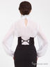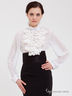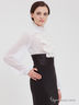 Романтичный полупрозрачный блузон с длинным рукавом и высоким воротом. Широкие рукава посажены на манжеты. Рельефные вытачки. Полочка декорирована гипюровым жабо.