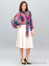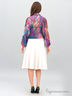 Стильный блузон из ткани с ярким принтом. Стояче-отложной ворот. Застежка на планку с пуговицами. Укороченные свободные рукава с манжетами. Низ изделия дополнен широкими завязками.