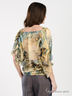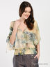 Модный блузон из тонкой полупрозрачной ткани. Глубокий V-образный вырез горловины. Укороченные свободные рукава-кимоно с лентами в кулиске. На полочке декоративная планка с пуговицами. Низ изделия присборен на резинках.
