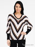 Повседневный блузон свободного силуэта. Выполнен из приятного на ощупь, эластичного трикотажа. V-образный вырез горловины. Длинные цельнокроеные рукава "летучая мышь" с широкими манжетами. Оригинальный узор в полоску. Прекрасный вариант как для отдыха, так и для работы!