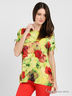 Яркий блузон свободного силуэта с округлым вырезом горловины и оригинальными короткими рукавами выполнен из шелковистого материала. Изделие украшено рисунками. Яркость и лаконичность дизайна.