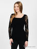 Эффектный блузон с округлым вырезом горловины и длинным рукавом выполнен из эластичного гипюра. Изделие декорировано вышивкой. Отличный вариант для торжественных случаев.