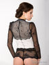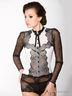 Боди с длинным рукавом из гипюра. Рукава прозрачные. Основная часть на подкладке из сетчатой ткани. Воротник-стойка из атласа. Декоративный бант из стрейч-шифона крепится к верхней пуговице на резинке, может отстегиваться.