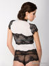 Классическое боди из кружева и гипюра на подкладке (сетчатая ткань). Бантик из стрейч-шифона крепится на верхнюю пуговицу (отстегивается). Воротник - стойка.