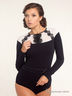 Боди из хлопка с длинным рукавом. Верх оформлен вставками из стрейч-шифона, гипюром и кружевом. Горловина, пояс и планка для пуговиц - стрейч-атлас. Пуговицы спереди декоративные. Застежка-пуговица на спинке.