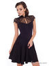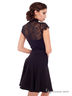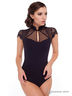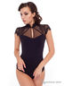 Боди с коротким рукавом. Верхняя часть выполнена из гипюра и вставок из сетчатой ткани. Вырез "капелька". Застежка-пуговица спереди. Воротник-стойка.