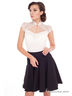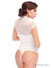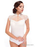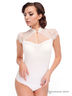 Боди с коротким рукавом. Верхняя часть выполнена из гипюра и вставок из сетчатой ткани. Вырез "капелька". Застежка-пуговица спереди. Воротник-стойка.