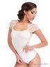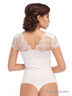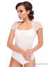 Нижняя часть боди выполнена из хлопка. Плечи и широкие лямки, переходящие на спину, перемычка на груди - стрейч-атлас. Зона декольте - кружево, соединенное гипюром в виде V образного выреза.