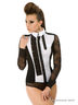 Стильное боди рубашечного типа из гипюра и поплина с декоративными накладками. Длинные рукава с широкими манжетами.