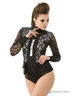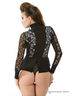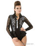 Соблазнительное боди из гипюра и поплина с баской на пуговицах. Длинные рукава с широкими манжетами. Воротник-стойка.