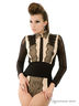 Стильное боди рубашечного типа из гипюра, сетки и вискозы. Длинные рукава. Спереди застежка на пуговицы.