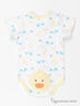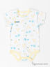Повседневное боди для ребенка. Округлый вырез горловины, короткие рукава. Снизу и спереди классическая боди-застежка. Оригинальный узор.