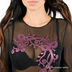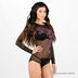 Элегантный боди с длинным рукавом из тонкой эластичной сеточки с крупным узором из атласа спереди. Округлый вырез отделан декоративным швом. Ластовица с хлопковой подкладкой застегивается на три крючка, расположеных в три ряда. Спинка боди декорирована удлиненным вырезом с застежкой на изящную пуговицу со стразом.