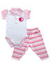 Чудесный комплект, состоящий из боди и брюк. Боди - с воротником-поло и короткими рукавами. Застегивается на кнопки снизу. Дополнительно декорировано контрастными вставками и аппликацией. Брюки - на эластичном поясе. Украшены рисунком в полоску.