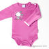 Замечательное боди из качественного трикотажного материала. Декоративный принт, две кнопки на левом плече, кнопочная застежка снизу. Низ рукавов декорирован белой тесьмой.