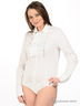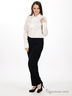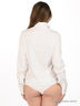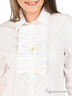 Детали: отложной воротник, полочка декорирована оригинальным жабо, застежка на пуговицы и на крючки на три позиции в области ластовицы