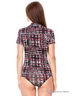 Стильное боди c воротником-стойкой и вырезом на груди «капля». Укороченный рукав. Яркий, интересный принт.