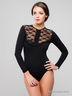 Оригинальное боди приталенного силуэта, дополненное ажурными вставками. Спереди декорировано рюшами. Модель с длинным рукавом. Вырез горловины круглый, сзади вырез "капля" с застежкой на пуговицу. Шикарная модель, в котором Вы всегда будете в центре внимания.