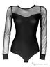Лаконичное облегающее боди-стринг из плотного эластичного полотна с полупрозрачными рукавами из мягкой сеточки. Застежка снизу на крючки. Отличны вариант для создания повседневного образа.