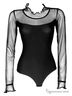 Облегающее боди-стринг из плотного эластичного полотна с полупрозрачными рукавами из мягкой сеточки. Горловина и рукава - воланы из жатой ленты с атласной лентой, отороченные бархатным кантом. Застежка снизу на крючки.