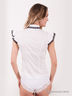 Боди облегающего кроя. Модель с короткими рукавами-крылышками и воротником стойка. Дополнено изделие планкой с застежкой на пуговицы и кружевом. Эта вещь станет прекрасной составляющей Вашего повседневного гардероба.