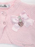 Болеро для девочки фактурной вязки. Изделие с застежкой на две пуговицы спереди и декорировано цветком из ткани. Отличный вариант как на каждый день, так и для праздника.