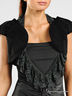 Стильное болеро оригинального дизайнерского кроя прекрасно дополнит Ваш вечерний наряд. Плотная неэластичная ткань. Плечи дополнены декоративными присборенными тканевыми накладками. Округлый крой планки.