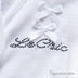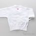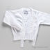 Модель прямого кроя застегивается на пуговицы. Ворот переходит в ленты, завязывающейся в бантик. Манжеты и низ изделия - трикотажные резинка. Декоративные атласные бантики и стразы на полочке.