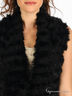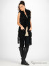 Удлиненное вязаное болеро оригинального фасона декорировано продетыми вставками из кроличьего меха.. Два передних кармана украшены бантиками.