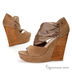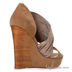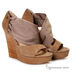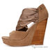 Женские босоножки из натуральной кожи на удобной танкетке, высота которой в пяточной части составляет 12 см, а в носочной 2,5 см. Верх обуви декорирован эластичной текстильной вставкой, а танкетка в пяточной части имитирована под дерево. Подкладка и вкладная стелька выполнены из натуральной кожи