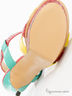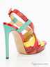 Невероятно яркие лакированные красные босоножки. Модель на высокой платформе и каблуке-шпильке, что делает хождение удобным и подчеркивает длину Ваших ножек. Каблук голубого цвета. Декорировано желтыми вставками и тиснением под кожу рептилии. Замочек на ремешке позволяет надежно фиксировать обувь на ноге.