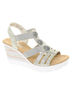 Повседневные женские босоножки из гладкой искусственной кожи и текстиля от швейцарского обувного бренда Rieker. Модель изготовлена в классическом стиле на танкетке.