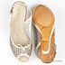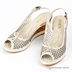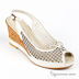 Босоножки женские на танкетке. Верх изделия выполнен из натуральной кожи светло-бежевого цвета. Удобная застежка на пятке. Анатомическая стелька. Танкетка "под пробку" частично отделана кожей. Изделие декорировано фигурной перфорацией и тонким кожаным бантиком в тон изделию.