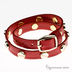 Длинный красный браслет из искусственной кожи будет стильно смотреться за счет многочисленных крупных металлических вставок. Модель застегивается на часовой ремень-замок, обматывается вокруг руки в несколько раз.