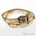 Длинный браслет цвета золота из искусственной кожи будет стильно смотреться за счет многочисленных крупных металлических вставок. Модель застегивается на часовой ремень-замок, обматывается вокруг руки в несколько раз.