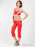 Спортивные эластичные бриджи прямого кроя. Отрезной пояс-резинка на веревочке. Модель украшена контрастными вставками и сетчатой тканью.