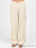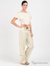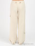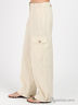 Детали: широкий втачной пояс, застежка на молнии и на пуговице, широкие брючины, низ брючин посажен на широкую полоску с застежкой на пуговицах, два накладных кармашка по бокам брючин.