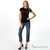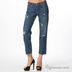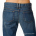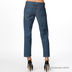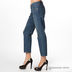 Брюки из синей эластичной джинсы, классического кроя 5 карманов. Штанины заужены к низу. Сзади небольшие накладные кармашки.